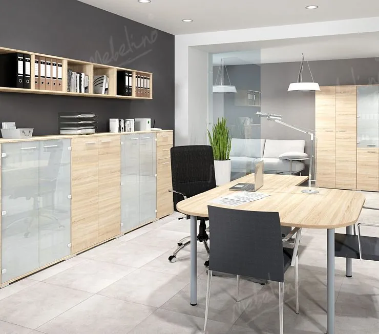 Модульный комплект класса «Люкс», составленный из столика, высоких тумб, распашных шкафов и навесных открытых полок