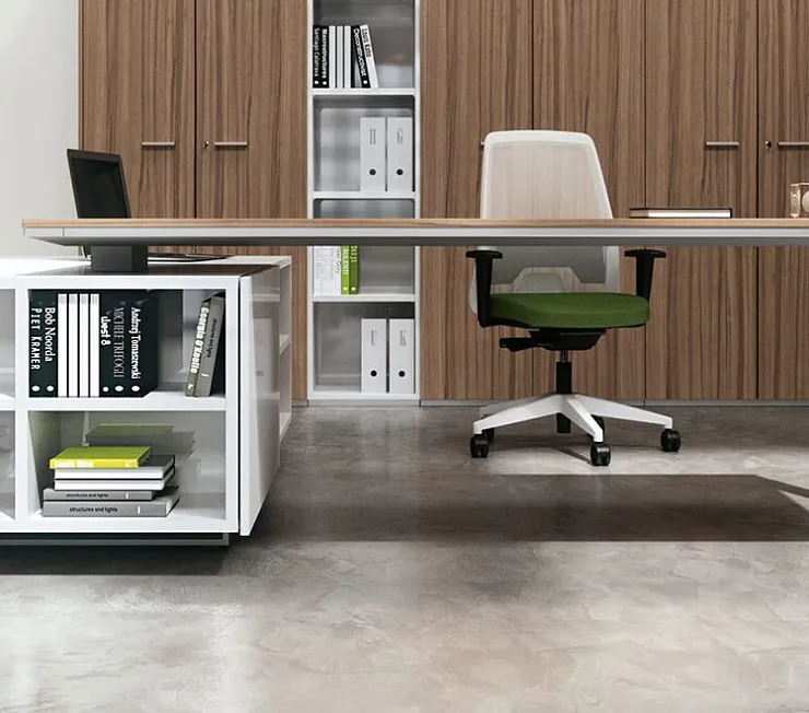 Набор из большого стола и несколькими вместительными системами хранения, включающими шкафы до потолка