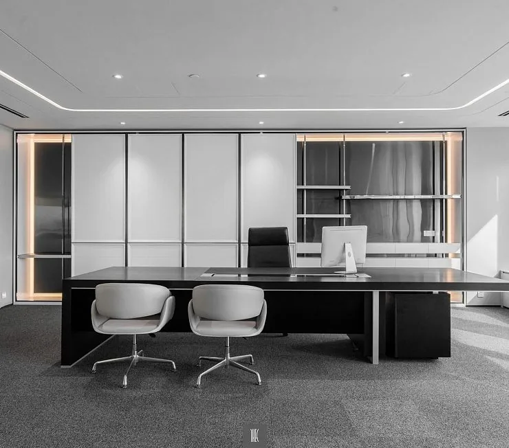 Стол в офис с местом для экрана и клавиатуры, а также чтобы поставить стулья для нескольких сотрудников. Модный дизайн