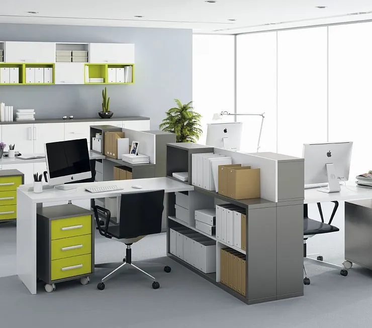 Красивый стол с боковой приставкой, включающей несколько полок, и мобильной тумбой с ящиками на роликах