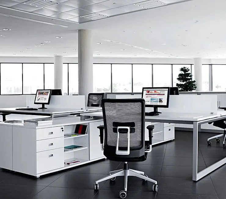 Функциональный стол для персонала, разделенный перегородкой, дополненный полками и тумбами с ящиками