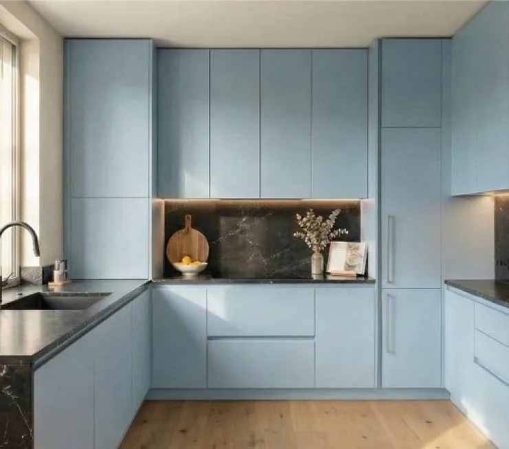 Все фасады — МДФ в матовой эмали небесного цвета (powder blue, близко к RAL 5024 осветлённый), гладкие, без фрезеровки, верхние шкафы практически до потолка. Столешница и фартук — чёрный мрамор Nero Marquina (или аналог) с белыми прожилками. Ниша фартука подсвечена LED-лентой тёплого тона. Встроенная техника: кофемашина и духовой шкаф в колонне (нержавеющая сталь), холодильник за голубым фасадом пенала. Смеситель — чёрный матовый. Фурнитура — безручечная система, хромированная ручка-рейлинг на пенале холодильника. Пол — дубовая доска светлого натурального оттенка. Габариты: левая линия 1800 мм, задняя стена 2800 мм, правая линия 1200 мм, глубина столешницы 600 мм, высота верхней линии 2600 мм, высота потолка 2700 мм.