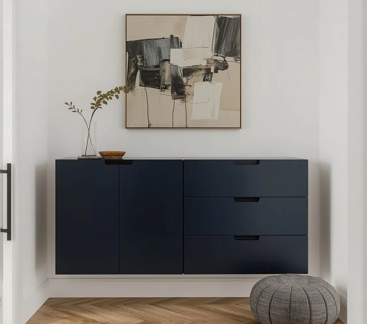 Современный и лаконичный обувной шкаф в глубоком оттенке полуночно-синего цвета. Модель крепится к стене, создавая эффект легкости и визуальной свободы пространства. Правая часть представлена тремя вместительными выдвижными ящиками, левая — двумя распашными фасадами с аккуратными вырезами под пальцы вместо ручек. Отличный выбор для современных интерьеров в стиле минимализм, лофт или сканди.
