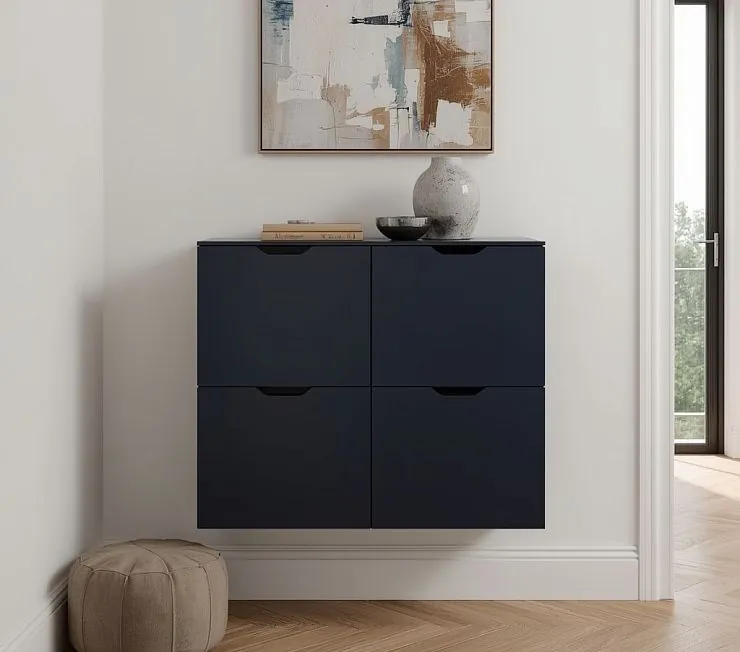 Современный настенный шкаф для обуви с четырьмя откидными створками, выполненный в насыщенном синем оттенке. Лаконичный дизайн и встроенные вырезы вместо ручек создают визуальную лёгкость, а подвесная конструкция освобождает пространство на полу, облегчая уборку. Отличное решение для прихожей в духе минимализма, сканди или современного урбанизма.