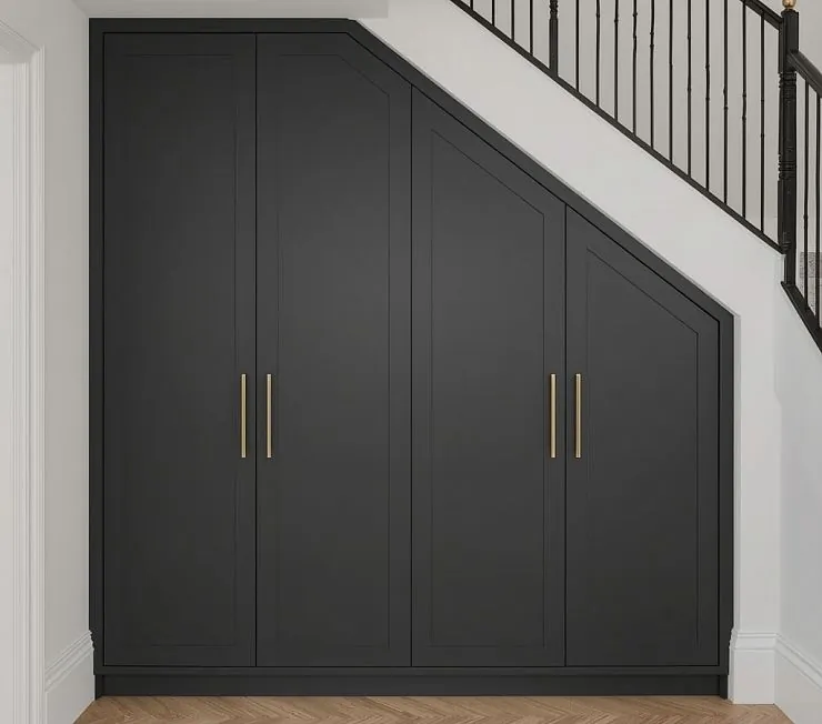 Современный шкаф под лестницей в глубоком графитовом оттенке с утончёнными золотыми ручками. Лаконичные гладкие фасады с лёгкой рамочной фрезеровкой придают конструкции стильный и сдержанный вид. Отлично подойдёт для организации хранения одежды, обуви или хозяйственных вещей, рационально используя каждый сантиметр пространства.