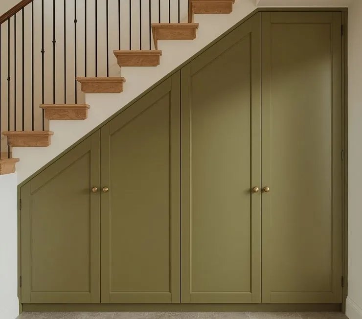 Встроенный шкаф под лестницей, выполненный в матовом оливковом оттенке. Классические филёнчатые фасады и круглые латунные ручки создают уютный и стильный акцент в интерьере. Оптимально для хранения одежды, обуви и хозяйственных принадлежностей.