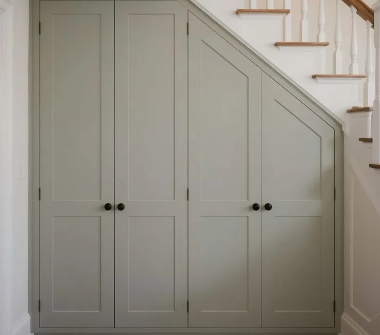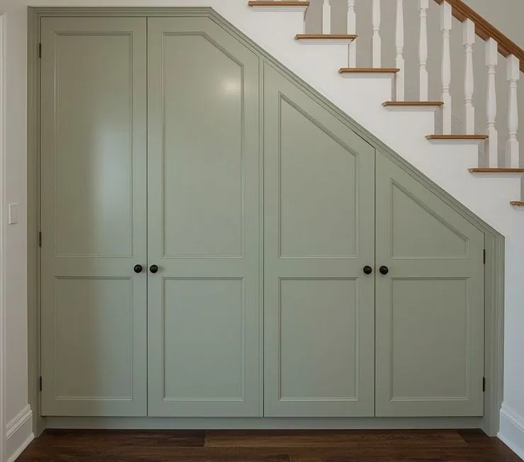 Встроенный шкаф в стиле transitional, выполненный в мягком пастельно-зелёном оттенке. Распашные фасады с классическими филёнками и аккуратными чёрными ручками создают гармоничный и уютный облик, а оптимальное использование пространства под лестницей обеспечивает вместительное хранение.