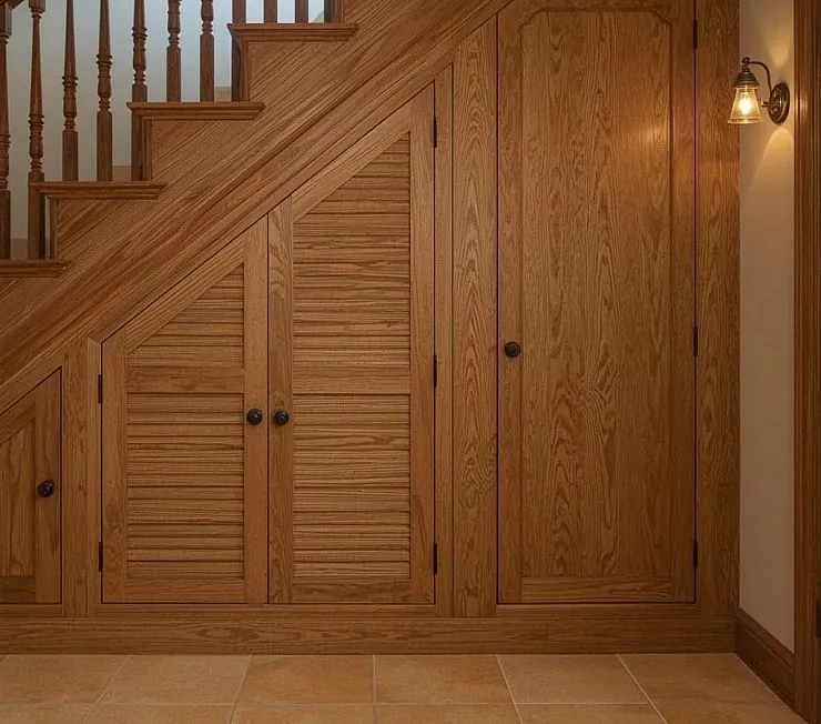 Тёплый и уютный шкаф под лестницей, выполненный из натурального дуба с выразительной древесной текстурой. Комбинация филёнчатых и жалюзийных дверей обеспечивает как вентиляцию, так и стильный внешний вид. Подходит для хранения сезонных вещей, обуви или хозяйственных принадлежностей.