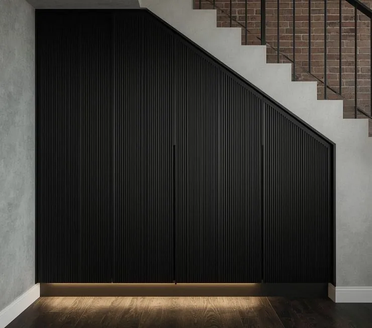 Элегантный встроенный шкаф под лестницей с дверцами, оформленными в виде тонких вертикальных реек. Глубокий черный цвет в сочетании с точечной LED-подсветкой внизу создает стильный и атмосферный акцент в интерьере. Идеально подходит для хранения обуви, одежды или хозяйственных принадлежностей, оптимизируя пространство.