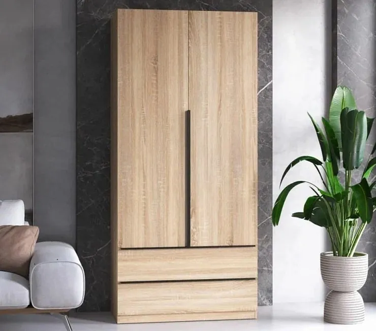 Компактное решение для гостиной в текстуре натурального дерева. Шкаф изготовлен из ЛДСП в практичной износостойкой пленке, цвет "дуб". Помимо секции со штангой и полками для одежды, оборудован двумя вместительными ящиками с пуш-фасадами. При производстве используется оригинальная фурнитура “Blum”. Выпуск под заказ, по замерам.