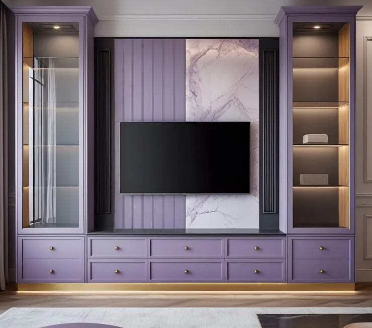 Элегантная ТВ-зона в стиле неоклассика с роскошной отделкой в сиреневом оттенке. Центр композиции украшен декоративной панелью с текстурой фиолетового мрамора и вертикальным фрезерованием. Стеклянные витрины с подсветкой по бокам идеально подходят для декора и техники. Нижние выдвижные ящики с золотыми ручками обеспечивают вместительное хранение. Нижняя и внутренняя подсветка создают уютное и стильное освещение.