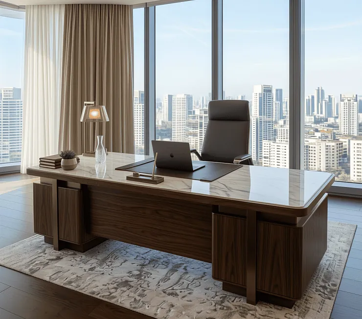 Интегрированные боковые тумбы позволяют удобно организовать хранение документов и рабочих аксессуаров, сохраняя на столе порядок и минимализм. Акцентные латунные или тёмно-бронзовые детали, а также скруглённые углы придают столу современный, статусный вид. Широкая рабочая поверхность (2,4×1 м) обеспечивает комфорт для решения стратегических задач и проведения деловых встреч.