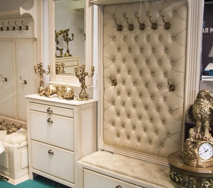 Классика, которой достойны лучшие. Оттенок слоновой кости, золотые вензельные ручки, кожаные мягкие зоны, стеганые стеновые панели и фрезерованные фасады создают атмосферу дворянского особняка 18 века. Корпус и фасады - МДФ в матовой эмали, устойчивой к царапинам. Мебель производится на заказ, под вашу прихожую.