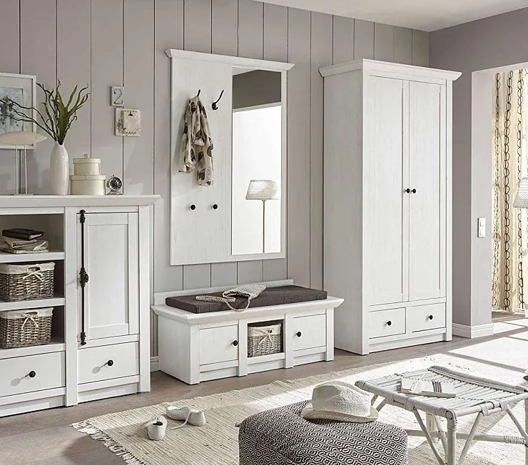 Набор мебели для просторной прихожей в белом окрасе. Центральное место занимает длинный комод для хранения обуви с мягким сиденьем. Вешалка прихожей имеет зеркало высотой 3/4 человеческого роста. Вместительный двустворчатый шкаф в узком корпусе и с карнизом имеет распашные двери и выдвижные ящики в классическом стиле. Высокий комод имеет две секции. Одна с открытыми полками, вторая с глухой дверью. Также имеются два выдвижных ящика. Корпус мебели изготовлен из древесноволокнистой плиты в шпоне, двери из массива дуба.