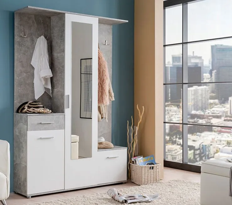 Двухцветная прихожая в бело-сером окрасе. Центральную часть прихожей занимает шкаф-пенал с зеркалом на двери. По бокам - вешалки с полками. Тумбы разной высоты. Малую можно использовать как сиденье. Обе тумбы имеют выдвижные ящики. Набор продаётся по цене производителя. Материал - ЛДСП "Egger".