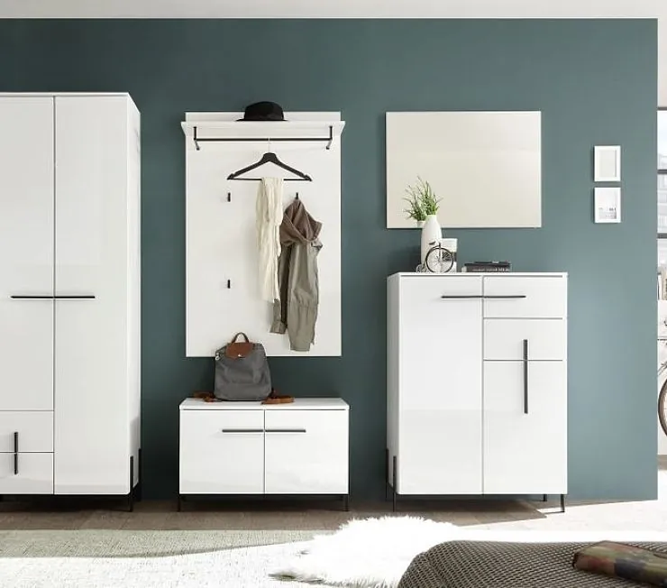 Мебельный набор выполнено полностью из подвесной мебели. Подвесной шкаф, комод и тумба. Вешалка с открытой полкой и штангой и зеркало над комодом также крепятся на стену. Имеет распашные двери и выдвижные ящики. Выполнена в белом цвете. Материал корпуса ЛДСП "Egger", фасадов МДФ в глянцевой эмали.
