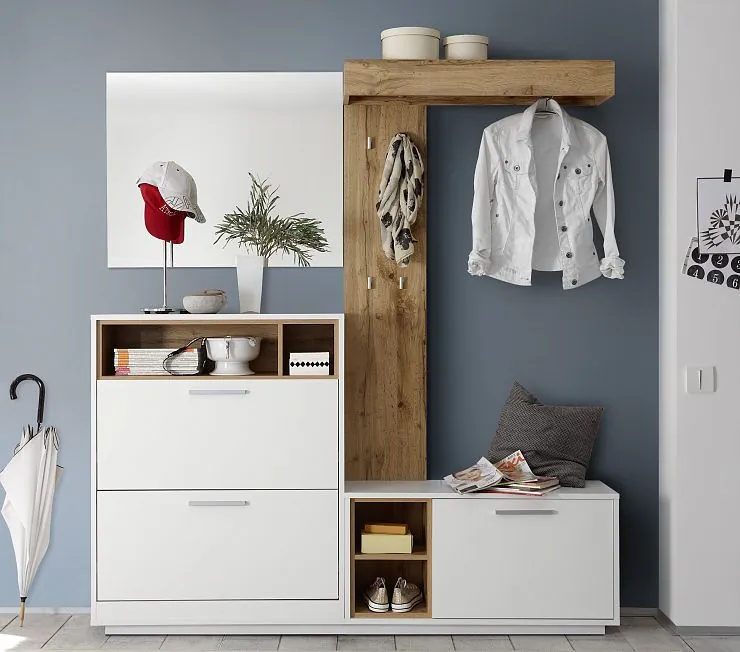 Мебельный комплект в маленькую прихожую из МДФ в шпоне и МДФ в матовой эмали. Вешалка и открыта полка выполнены в натуральном цвете дерева. Основной цвет задают комод с выдвижными ящиками и открытой полкой и тумба с выдвижным ящиком и открытыми полками. Также имеется зеркало не большое и не маленькое. Прихожая продаётся по стоимости производителя.