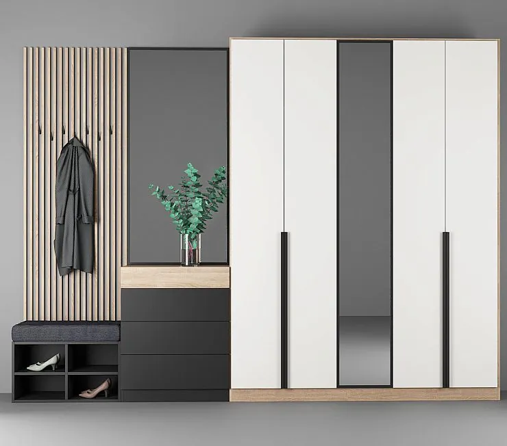 Комплект мебели в прихожую включает вместительный шкаф, достаточный для размещения в нём всего гардероба. Шкаф можно заказать отдельно для комнаты. Корпус мебели произведен из МДФ в шпоне и ЛДСП "Эггер", фасады - из МДФ в матовой эмали. Высокое зеркало на двери шкафа при желании украшается пескоструйным рисунком. Изготовление на заказ по цене фабрики.