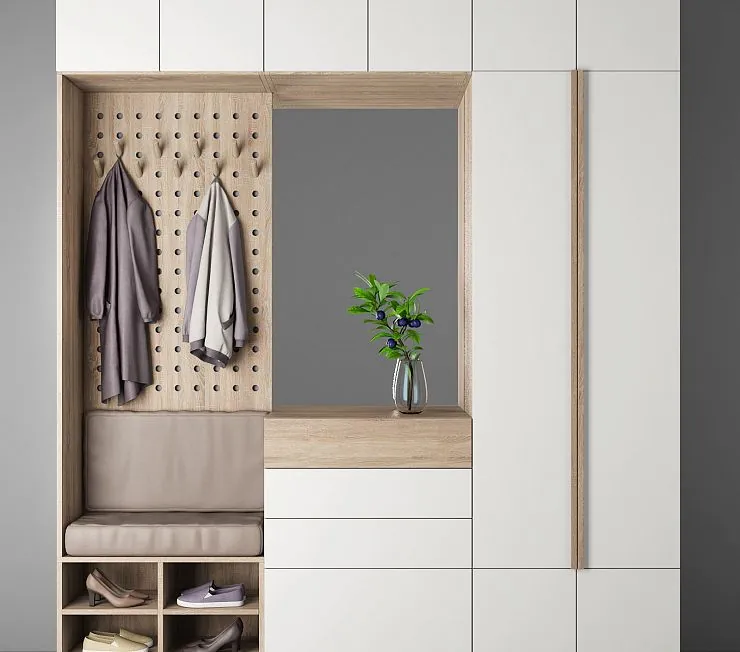 Стильный гарнитур для прихожей с пуш-фасадами, вместительным двустворчатым шкафом, и обувницей. Изменяемая высота крючков удобна для размещения одежды. Обувница дополнена мягкой зоной со спинкой. Помимо шкафа гарнитур включает 11 ящиков и зон хранения. Корпус производится из МДФ в шпоне натурального дерева и ЛДСП «Эггер» (Австрия), фасады - МДФ в матовой эмали. Для заказа необходим выезд замерщика.