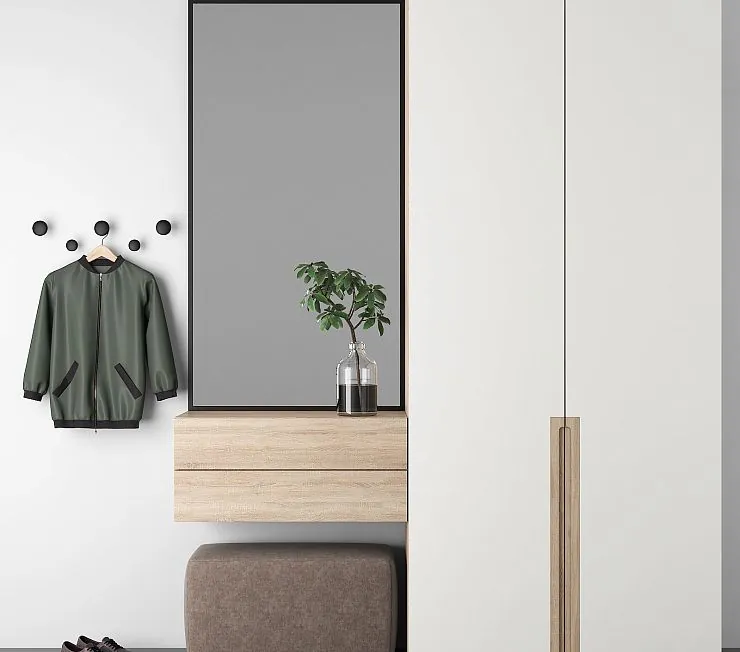 Благодаря заглубленным ручкам и оригинально оформленной вешалке этот гарнитур – находка для ценителей современных или хай-тек интерьеров. Гарнитур включает двухстворчатый шкаф, навесные ящики с пуш-фасадами и черный алюминиевый контур. Корпус - из МДФ в шпоне бука, с использованием ЛДСП «Egger». Фасады шкафа - премиум-МДФ в матовой эмали. Изготавливается под размеры вашей прихожей.
