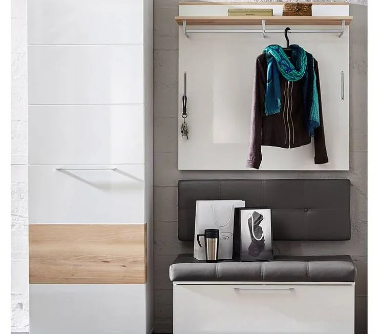 Белая прихожая с мягким сиденьем и шкафом с выдвижными ящиками. Панель прихожей оборудована продольной штангой, что позволяет повесить достаточно много вещей. Удобно когда будут гости. Мягкое сиденье сделано на тумбе и снабжено такой же мягкой подвесной спинкой. Материал корпуса - ЛДСП "Egger", фасадов - МДФ в матовой эмали и МДФ в шпоне.