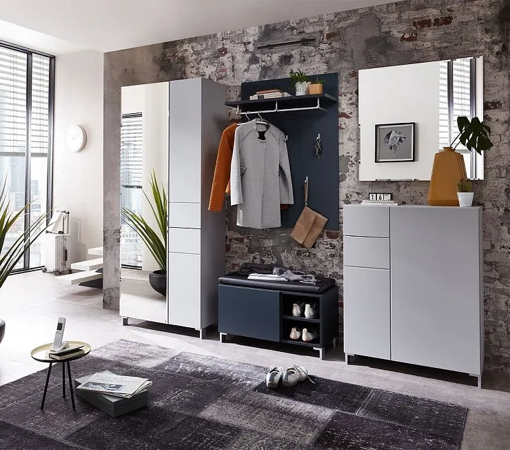Мебель в современном стиле с высоким зеркалом в небольшой коридор. Корпус шкафа и тумб производятся из ЛДСП "Эггер", фасады из МДФ в матовой эмали, что обеспечит долговечность и неприхотливость комплекта мебели. Комплект выполнен в двухцветном окрасе. Основной цвет - светлый, почти белый. Тумба с сиденьем и щит вешалки - в тёмно-сером, почти чёрном цвете.