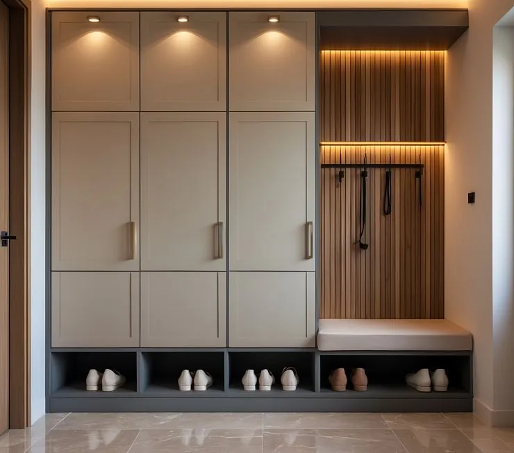 Современный встроенный шкаф для прихожей в мягком бежево-сером тоне с акцентной вертикальной деревянной панелью и встроенной LED-подсветкой. Фасады с фрезеровкой и скрытой фурнитурой создают аккуратный минималистичный вид. В конструкции предусмотрены вместительные закрытые шкафы для одежды, открытые секции для обуви и мягкое сиденье для переобувания. Крючки на деревянной панели идеально подходят для размещения сумок, верхней одежды или аксессуаров.