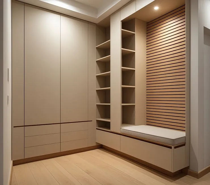 Элегантный минималистичный мебельный комплекс для прихожей в тёплых бежево-древесных тонах. Встроенные закрытые шкафы сочетаются с открытыми полками для повседневных вещей и декора. Зона с мягким сиденьем и декоративной панелью из горизонтальных реек создаёт уютное место для переобувания.