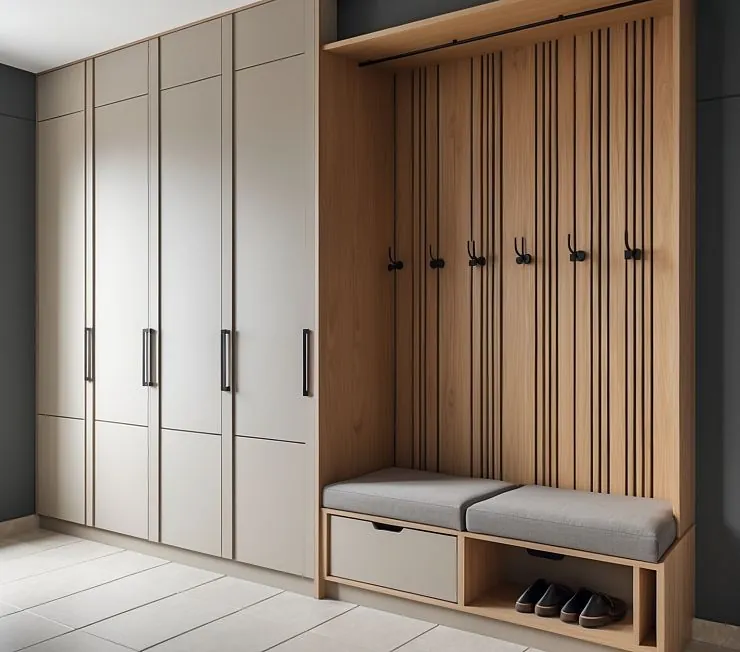 Встроенный комплект мебели для прихожей в современном стиле с элементами скандинавского минимализма. Светлые матовые фасады гармонично сочетаются с натуральным тёплым деревом и вертикальными декоративными рейками. Оснащён множеством крючков для верхней одежды, мягким сиденьем для переобувания, закрытыми шкафами для хранения и нишами для обуви.