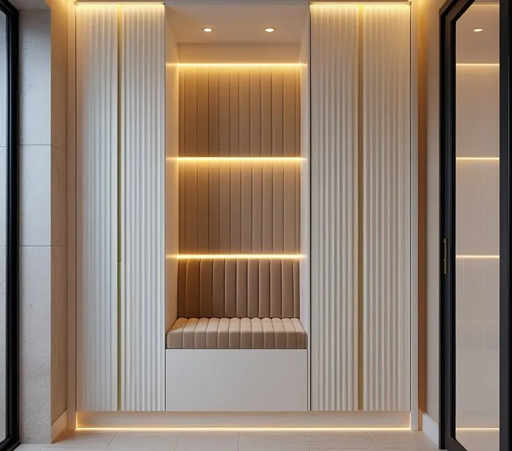 Современный встроенный модуль для прихожей с вертикальными фрезерованными фасадами и мягкой зоной для сидения в обивке из велюра. Теплая светодиодная подсветка по периметру и в нише создает уютную атмосферу и визуально подчеркивает геометрию мебели. Идеальное решение для тех, кто ценит минимализм, премиальные материалы и функциональность в одном.