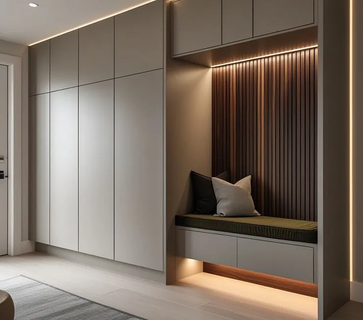 Элегантный встроенный комплект мебели в скандинавском минималистичном стиле. Гладкие матовые фасады светло-бежевого оттенка создают аккуратный и спокойный облик, а ниша с вертикальными деревянными рейками тёмного тона добавляет глубины и тепла. Мягкое сиденье оливкового цвета с декоративными подушками делает зону комфортной для переобувания и отдыха. LED-подсветка по периметру и снизу создаёт атмосферное освещение. Вместительные шкафы обеспечивают достаточное пространство для хранения верхней одежды и аксессуаров.