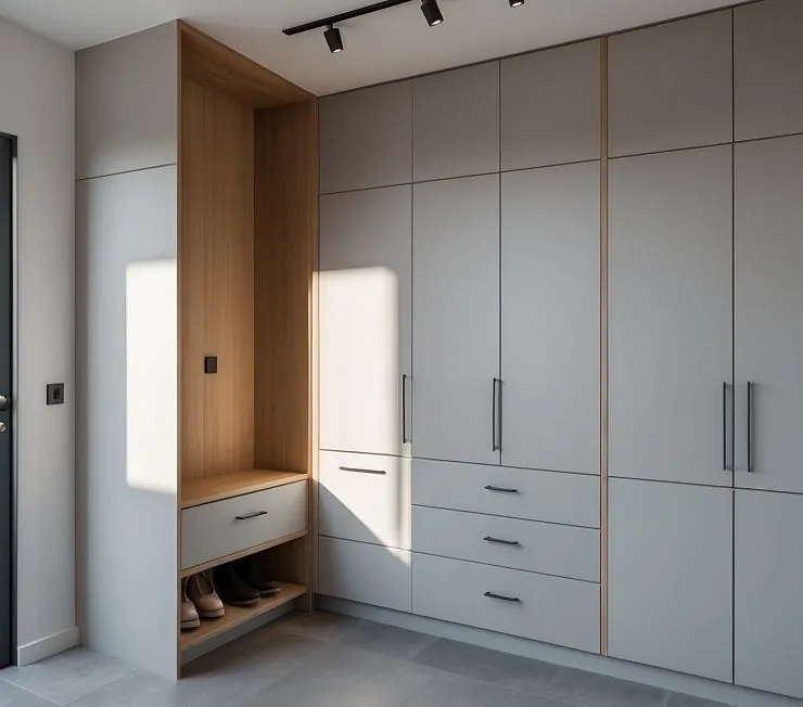 Современный минималистичный встроенный шкаф для прихожей в матовом сером цвете с вставками под светлый дуб. Открытая ниша с выдвижным ящиком и полкой для обуви создаёт удобную зону ожидания, а высокие шкафы с распашными дверцами обеспечивают вместительное хранение верхней одежды и аксессуаров. Лаконичная фурнитура подчёркивает строгий геометричный дизайн.