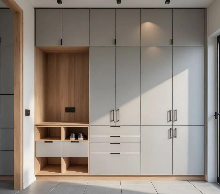 Лаконичная встроенная прихожая в скандинавском стиле с отделкой под светлый дуб и матовыми фасадами нежно-серого цвета. Простая геометрия и скрытые петли создают эффект монолитности. Функциональное наполнение включает открытую зону для хранения обуви, выдвижные ящики для аксессуаров и просторные шкафы для верхней одежды.