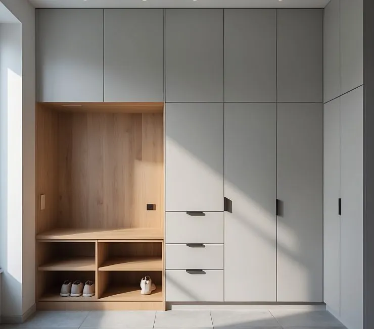 Современный встроенный гардероб в скандинавском стиле с фасадами матового светло-серого цвета и отделкой натуральным шпоном дуба. Функциональная зона для сидения с обувницей, тремя выдвижными ящиками и вместительными шкафами для верхней одежды. Лаконичные чёрные ручки и точечное освещение создают гармоничный минималистичный образ.