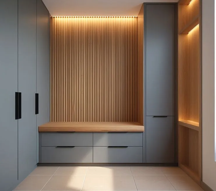Современный встроенный мебельный гарнитур для прихожей в стиле скандинавский минимализм. Сочетание матовых серых фасадов с натуральным деревом и вертикальными реечными панелями создаёт тёплую и уютную атмосферу. В комплект входят закрытые шкафы для одежды, вместительные ящики, открытые полки с подсветкой и удобная скамья для переобувания.