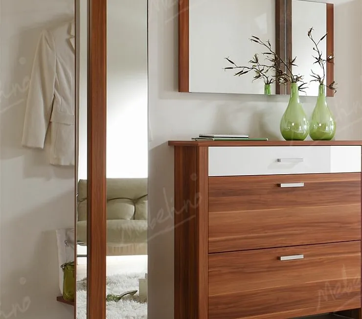 Узкая прихожая в натуральном коричневом цвете с контрастной белой вставкой для комнат маленьких размеров.