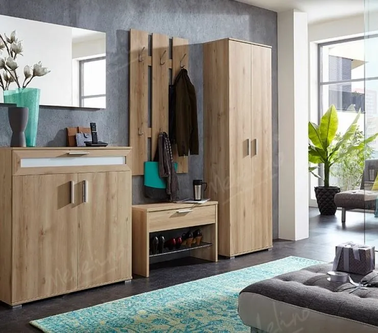 Набор мебели для коридора: двухстворчатый шкаф и комод с прямыми гладкими фасадами, лаконичными ручками и ножками.