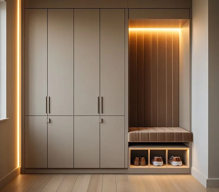 Элегантная встроенная прихожая, выполненная в теплых бежево-карамельных тонах, создаёт атмосферу уюта и порядка с первого шага в дом. Вертикальные мягкие панели с бархатной текстурой обеспечивают комфорт при ожидании, а встроенная LED-подсветка добавляет интерьеру глубину и стильный акцент. Под сиденьем предусмотрены открытые ниши для обуви с отдельной подсветкой. Вместительные шкафы с лаконичными ручками позволяют аккуратно разместить верхнюю одежду, аксессуары и сезонные вещи, сохраняя минимализм пространства.