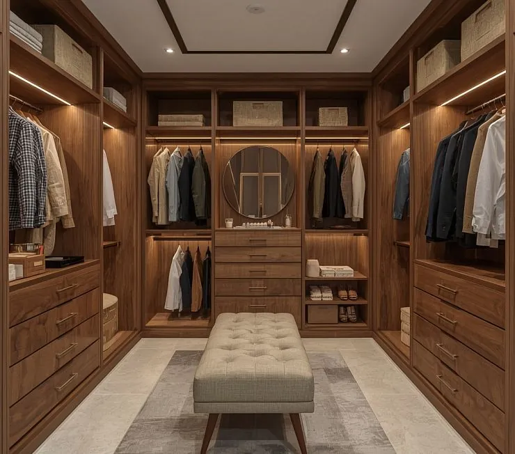 Роскошная гардеробная система, выполненная из МДФ с отделкой шпоном тёмного ореха. Оснащена симметричными секциями с вешалками для одежды, открытыми полками и вместительными выдвижными ящиками. Центральная зона дополнена круглым зеркалом и комодом для аксессуаров. Встроенная LED-подсветка подчёркивает текстуру древесины и создаёт атмосферу уюта. Пространство идеально подходит для хранения одежды, обуви и аксессуаров, сохраняя при этом эстетику и порядок.