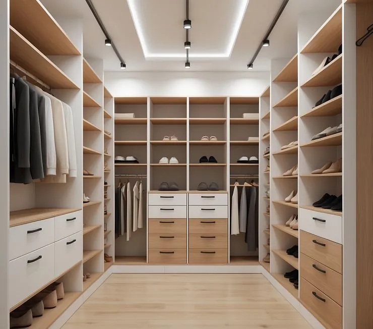 Элегантная гардеробная в скандинавском стиле с акцентом на натуральные материалы и практичность. Белоснежные фасады сочетаются с текстурой светлого дерева, создавая ощущение уюта и лёгкости. Открытые полки по периметру обеспечивают быстрый доступ к вещам и обуви, а центральные выдвижные ящики с контрастной фурнитурой делают интерьер функциональным. Потолочное трековое освещение равномерно заливает светом весь шкаф, подчёркивая минимализм и чистоту линий.