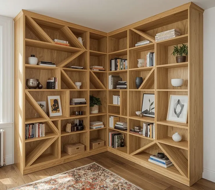 Угловой книжный шкаф из натурального дубового шпона с оригинальной геометрией полок: диагональные и прямые секции перемежаются, создавая динамичный визуальный ритм. Полки рассчитаны на книги, декор и хранение. Изготавливается по индивидуальному проекту с точной подгонкой под помещение и подбором шпона из каталога Woodstock.