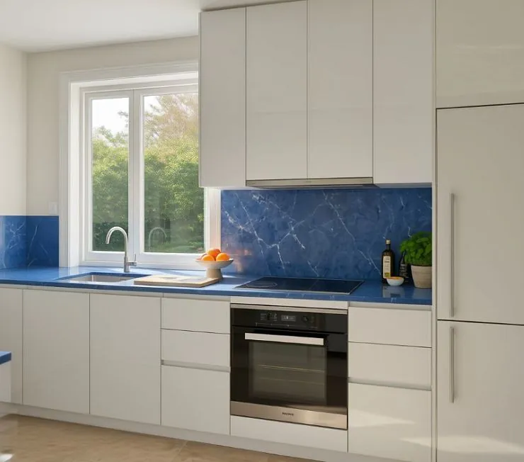 Белая глянцевая кухня со столешницей и фартуком из натурального синего мрамора. Сочетание редкое и смелое: чистый белый лак и насыщенный кобальтовый камень с белыми прожилками держат весь интерьер на одном ярком акценте без дополнительного декора.