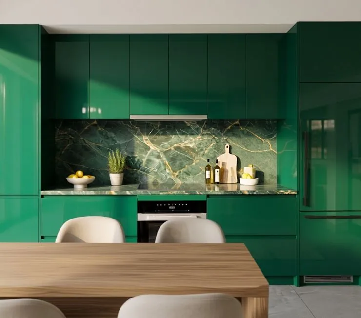 Изумрудно-зелёная кухня в глянцевом лаке со столешницей и фартуком из натурального зелёного мрамора с золотистыми прожилками. Цвет здесь работает на максимум: насыщенный зелёный, зеркальный блеск лакированных фасадов, золото в камне — кухня выглядит как самостоятельный арт-объект.