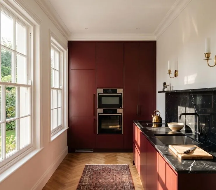Кухня в двух оттенках красного — винно-бордовый пенал до потолка и кораллово-терракотовые нижние шкафы. Матовый МДФ без ручек, чистая минималистичная линия. Столешница и фартук из натурального мрамора Nero Marquina уравновешивают насыщенный красный и задают тон всему помещению. Под рабочей поверхностью — встроенная светодиодная подсветка. Духовка и пароварка скрыты в высоком пенале, латунные бра и потолочный карниз добавляют нотку неоклассики.