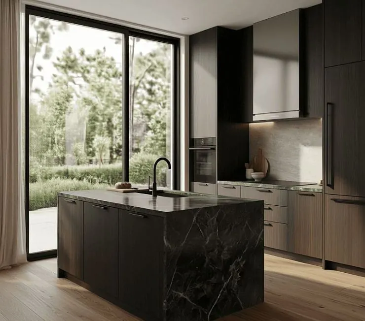 Большие окна наполняют пространство естественным светом, подчеркивая природную красоту материалов. Такой интерьер идеально впишется в современные квартиры и дома, придавая кухне статус эксклюзивного пространства для вдохновения и семейных встреч.