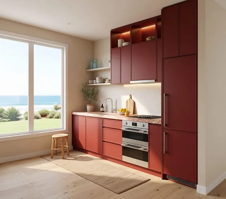 Кухня в трёх тёплых оттенках: винно-бордовый верх, терракотово-красный низ и розовый камень столешницы. Сочетание неочевидное, но очень гармоничное — все три цвета находятся в одной тёплой гамме и работают на ощущение уюта и живого интерьера.