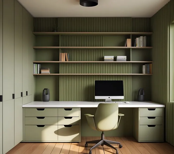 Стильный и функциональный встроенный гарнитур для домашнего кабинета. Выполнен в благородном оливковом оттенке с акцентом на вертикальные панели и открытые полки во всю стену. Просторная рабочая поверхность с белой столешницей создаёт контраст и лёгкость, а вместительные выдвижные ящики обеспечивают идеальный порядок. Гарнитур подойдёт как для современного офиса, так и для домашнего кабинета.