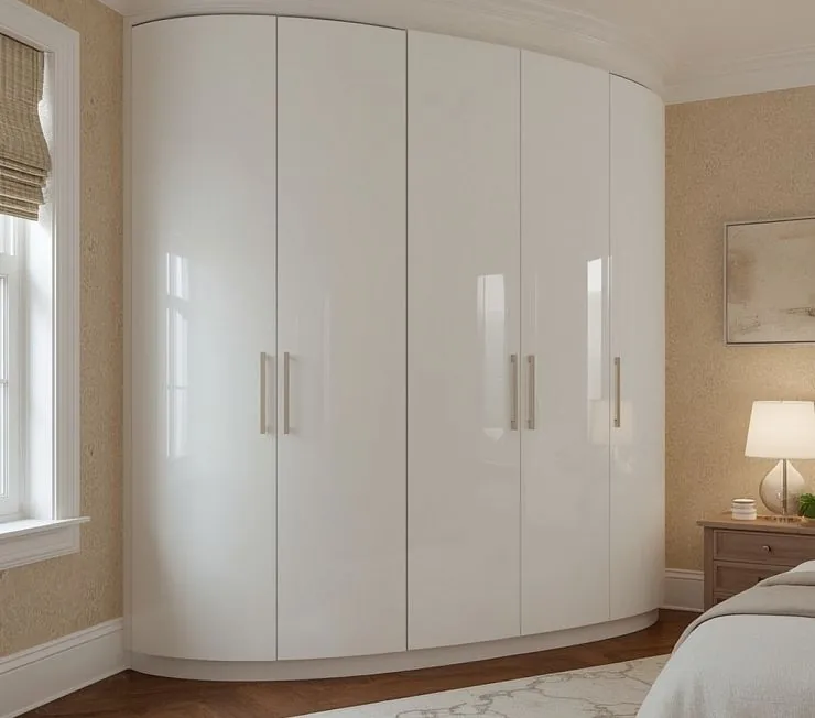 Современный радиусный шкаф с глянцевыми белыми фасадами — идеальное решение для спальни или гостиной с изысканным интерьером. Плавная изогнутая форма органично вписывается в пространство, а гладкие фасады без лишнего декора визуально увеличивают помещение. Вместительные секции обеспечат удобное хранение одежды, белья и аксессуаров. Лаконичные металлические ручки подчёркивают минималистичный стиль мебели.