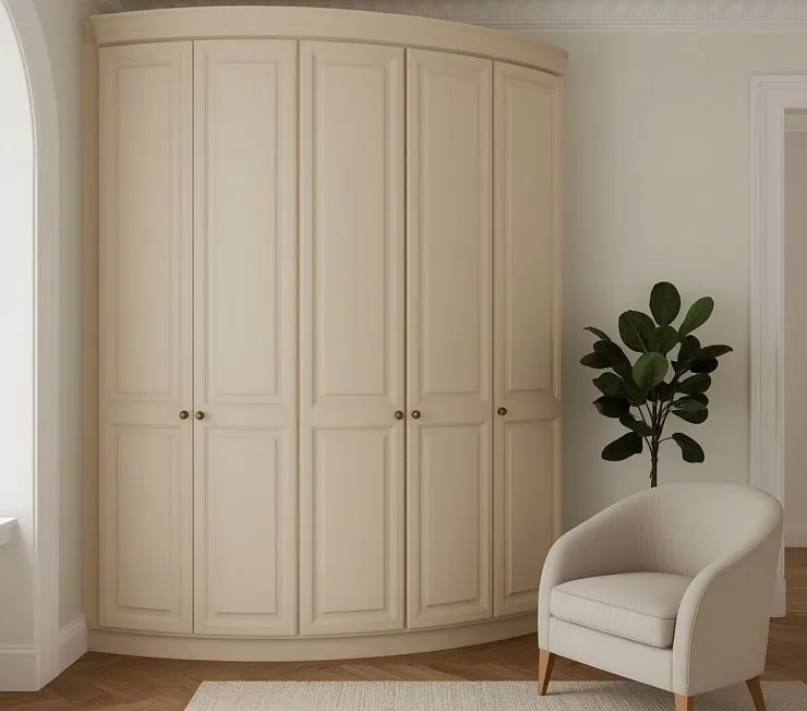 Элегантный радиусный шкаф в мягком бежевом оттенке с классическими филёнчатыми фасадами станет гармоничным дополнением любого интерьера. Изогнутая форма позволяет эффективно использовать угловое пространство, а изысканные латунные ручки подчёркивают утончённость дизайна. Шкаф отличается вместительностью и продуманной внутренней организацией, что делает его идеальным для хранения одежды, белья и аксессуаров.