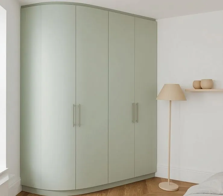 Минималистичный радиусный шкаф в нежном оттенке бледного шалфея — идеальное решение для современного интерьера в спокойных тонах. Мягкие плавные линии фасадов создают ощущение уюта, а отсутствие лишнего декора подчёркивает лаконичность стиля. Вместительная внутренняя организация позволяет хранить одежду, аксессуары и текстиль, сохраняя порядок и гармонию в пространстве.